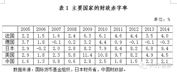 表1为2005年以来主要国家的赤字率。美国、日本等国的赤字率持续超过马约提出的3%,即使是欧元区的法国和德国,有些年份也远高于3%。可见,马约的3%并不是一个明确的标准或者警戒线,各国会根据经济运行情况来调整自身的财政负债标准。我国的财政赤字率则很低,长期低于3%,远低于美日等国的水平。