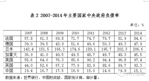 根据2013年12月审计署对我国政府性债务的审计结果,2012年末,我国中央政府和地方政府负有偿还责任的债务占GDP的比例分别为17.7%和18.0%,合计35.7%,这与主要国家相比,都是比较低的。美日等发达国家的广义政府负债率均超过100%(2012年日本为227%,法国为114%,美国为101%)(数据来源为国际货币基金组织)。即使包括政府负有担保责任和救助责任的债务,我国广义政府负债率也只有52%。