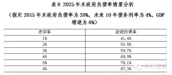 表7反映的是,假定未来10年每年的本币债务利率为4%, GDP增速保持在6%,而2015年末政府负债率以及赤字率发生变化的情况下,2025年末的政府负债率。若2015年末政府负债率为70%,也就是2015年末的政府债务余额为47万亿元(比现有水平高21万亿元),且赤字率为4%,2025年末政府的负债率仍将低于95%。