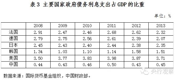 近年来,我国中央政府债务率呈稳中下降的趋势。已由2007年的19.4%,下降到2014年的15.1%,这个水平低于其他主要国家(见表2)。较低的政府负债率使得我国政府债务利息支出较低。2013年,我国政府债务利息支出占GDP的比重仅为0.45%,远低于其他国家(见表3)。