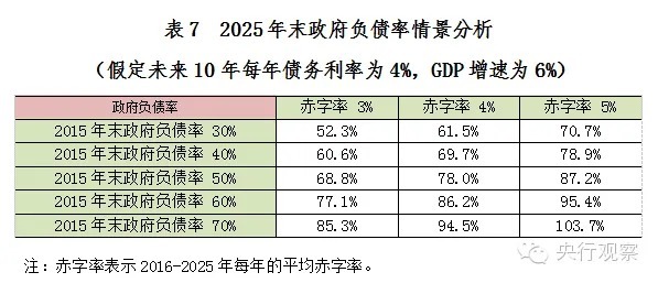 表6分析的是,2015年末政府负债率为39%(截至2015年三季度,中央政府债务余额为10.3万亿元,2015年地方政府性债务限额为16万亿元,2015年我国GDP为67.6万亿元,通过以上数据估算得到2015年末我国政府负债率约为39%),假定未来10年每年的基础财政赤字率保持3%不变,在各种GDP增速和债务利率条件下,2025年末我国的政府负债率。可以发现,在债务利率上升到6%且GDP增速为4%的较差的情况下,2025年末的政府负债率将会上升到79.7%,仍低于主要发达国家的水平;而如果GDP增速较快,达到7%,即使债务利率为6%,2025年末的政府负债率仍将低于65%。